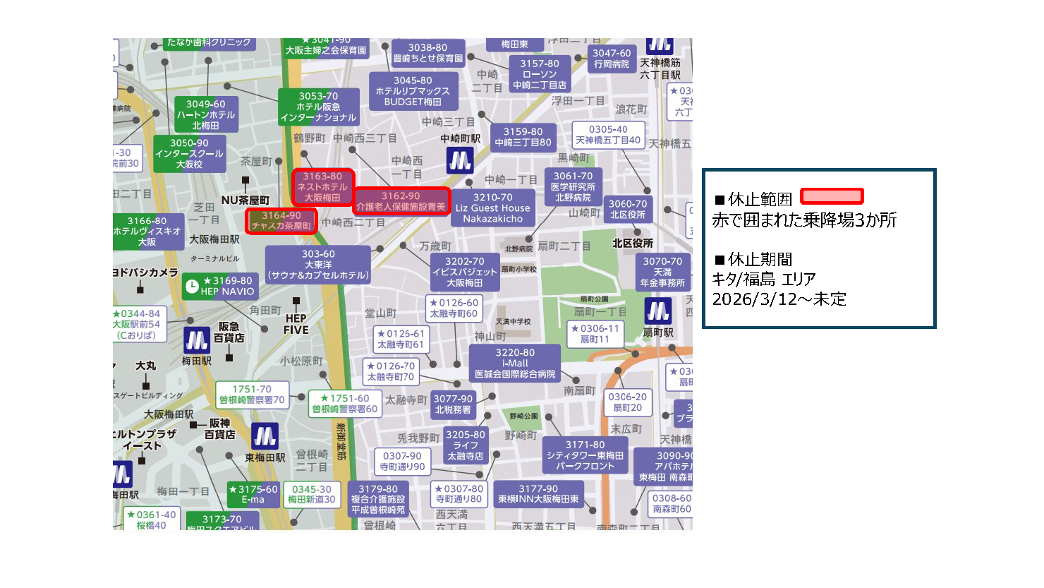 また交通規制に伴い一部乗降場所の休止を行っております。