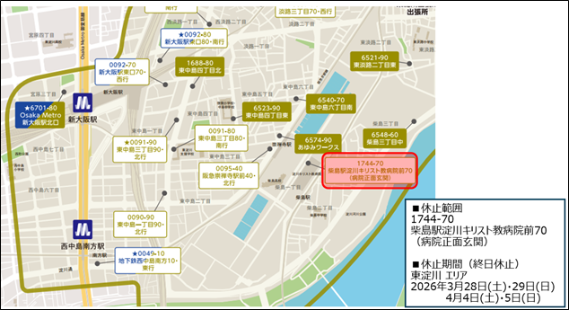 2026年3月28日(土)・29日(日)・4月4日(土)・5日(日)の4日間、「柴島浄水場桜並木通り抜け」の開催に伴い、東淀川エリアの一部乗降場所を休止します。